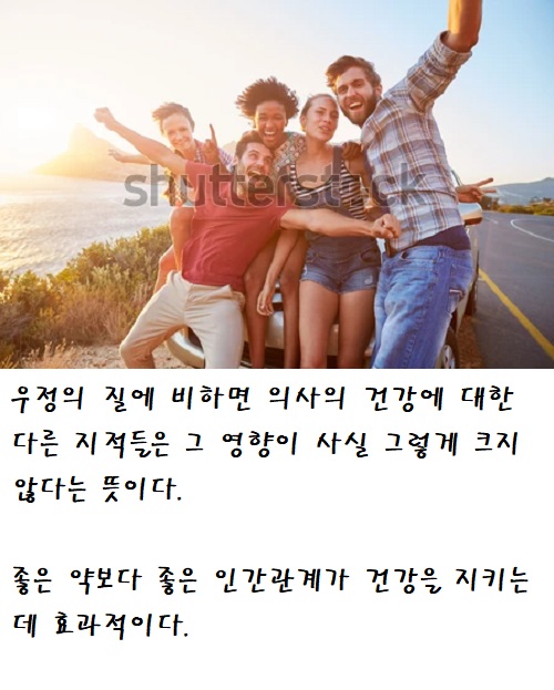 이는 당신의 우정의 질과 금연 여부에 비하면 다른 동네 의사의 건강에 대한 지적들은 그 영향이 사실 그렇게 크지 않다는 뜻이다. 좋은 약보다 좋은 인간관계가 건강을 지키는데 효과적이다.
