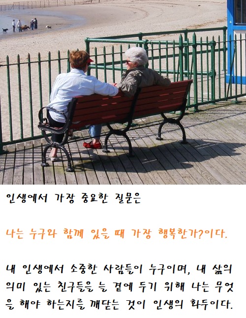 인생에서 중요한 질문은 ‘내가 무엇을 할 때 행복한가?’ 와 더불어 ‘나는 누구와 함께 있을 때 가장 행복한가?’ 이다. 내 인생에서 소중한 사람들이 누구이며, 내 삶의 의미 있는 친구들을 늘 곁에 두기 위해 나는 무엇을 해야 하는지를 깨닫는 건 인생의 화두이다.