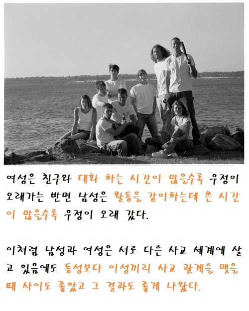 여성은 친구와 대화 하는 시간이 많을수록 우정이 오래가는 반면, 남성의 경우는 대화의 시간은 전혀 상관 관계가 없었다. 남성은 ‘활동을 같이하는’데 쓴 시간이 많을수록 우정이 오래 갔다.